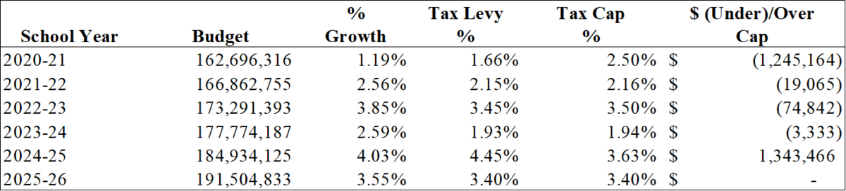 The current 2025-26 school budget was adopted at the tax cap, but expenditure reductions were again necessary, and primarily came from the net reduction of 6 faculty and staff positions. Below is a summary of the past six years, which illustrates the shift to budgets at or above the cap versus well below the cap (2020-21).